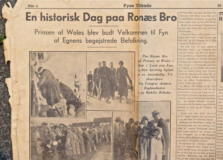 Lærer Jacobsen fra Rolund lavede et improviseret skilt: ”Welcome to wholesale-society in Ronæsbro” (Brugsforeningen i Ronæsbro). Et engelsk og et dansk flag prydede den lange anløbsbro. Så kom de små prikker til syne på himlen i nordvest, fordi de først skulle en tur hen over Lillebæltsbro-byggeriet. Så sukkede folk højlydt, fordi flyverne gik mod Wedellsborg, men efter at have set det fra oven, vendte de tilbage for at lande. Endelig steg prinsen i land i gråt flonnel og et flot rødt halstørklæde efter at have afført sig sin flyverdragt.