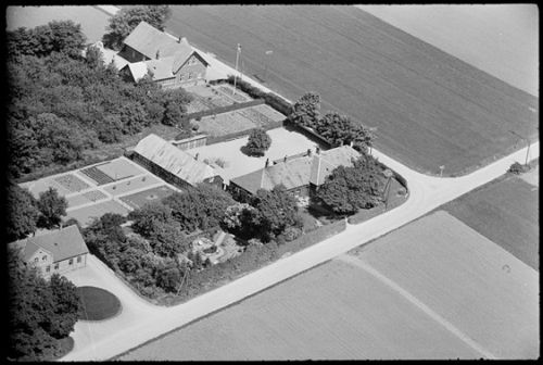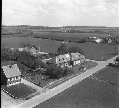 Luftfoto af Husby Skole i 1939 længe før der var tænkt på mig. Dengang var der lærerboliger på skolen, og lærerne havde meget flotte pryd- og nyttehaver rundt om skolen. I skolegården ses skuret med toiletretirader.