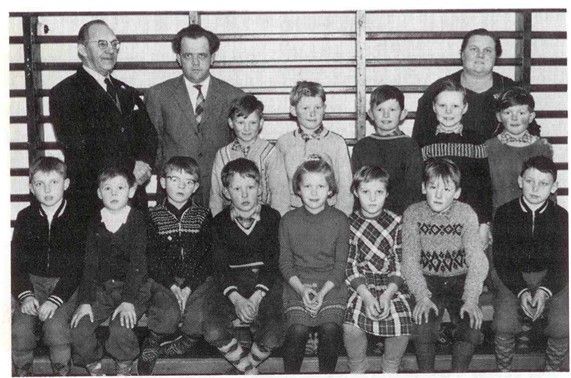 Først og fremmest var førstelærer Andersen der stadig. Jeg tror, han måske havde 40 års jubilæum, mens vi gik i HusbySkole. Altid ulasteligt klædt og med sølvbriller og tørklæde i lommen, og ikke kun fordi der som her blev taget billede. Det var hans daglige antræk. Hvis han om morgenen havde sit fine mørke tøj på, når han var ude at lufte sin hvide puddel, vidste vi, at vi ville få fri til middag. Så skulle han nemlig medvirke som kordegn ved en begravelse i kirken. Det var ikke noget, vi blev kede af.