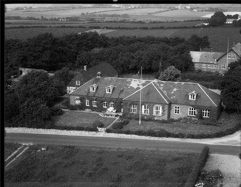 Luftfoto af Husby Skole i 1939 længe før der var tænkt på mig. Dengang var der lærerboliger på skolen, og lærerne havde meget flotte pryd- og nyttehaver rundt om skolen. I skolegården ses skuret med toiletretirader.