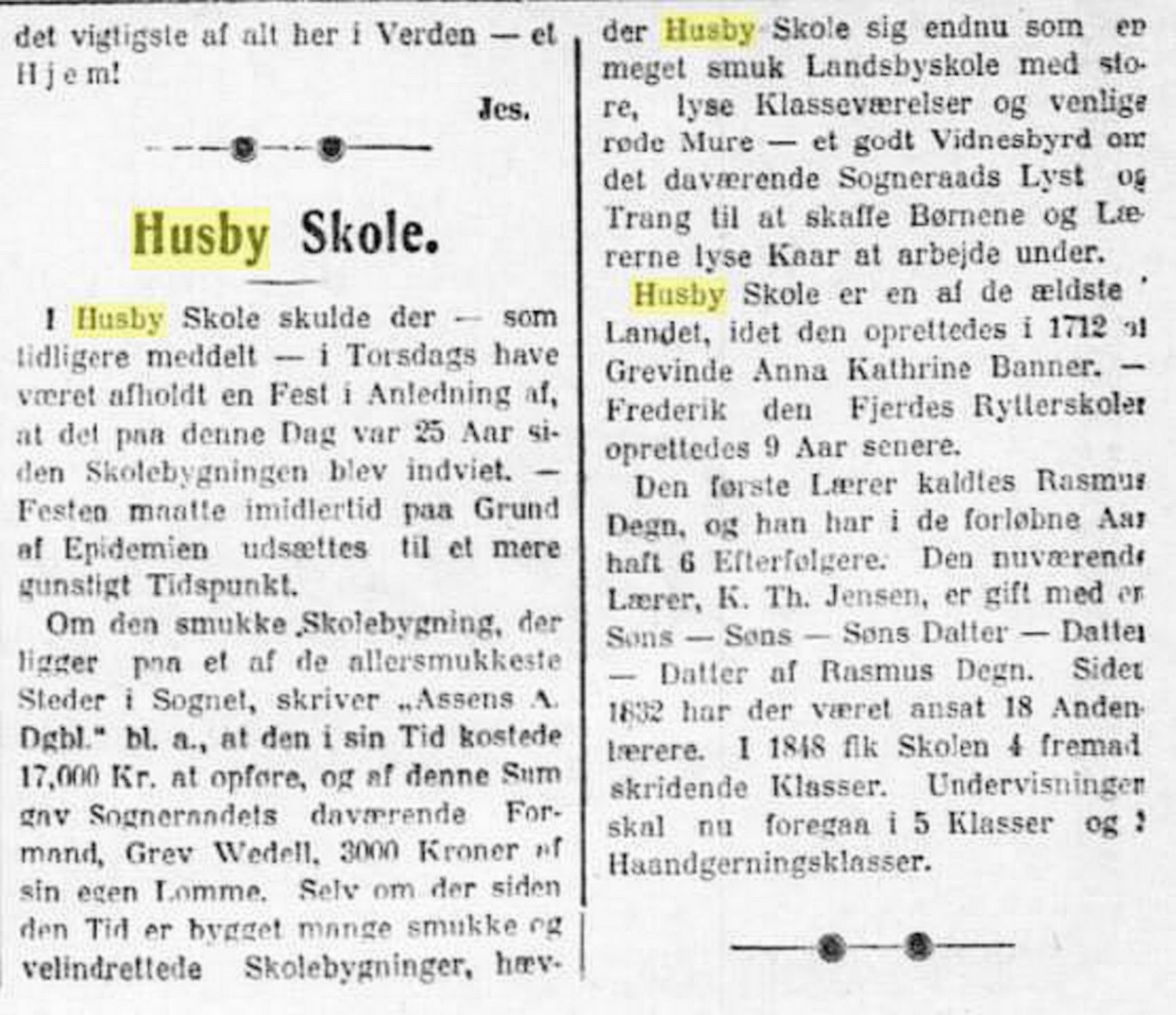 En artikel i Fyens Stiftstidende 3.11. 1918 viser, hvor meget respekt, der var i forhold til sygdommen. Husby Skole skulle i november 1918 have fejret "den smukke skolebygning", der da siden 1893 havde ligget i 25 år på "et af de allersmukkeste steder" i sognet, i stedet måtte jubilæumsfesten aflyses. Skolen med den smukke skolebygning på det allersmukkeste sted ligger der heldigvis end, nu dog som smykkeværksted. I år har skolebygningen 125 års jubilæum. Måske burde den fredes! Men dejligt, at Bent Larsen og familie har passet så godt på den, siden de overtog den efter skolens nedlæggelse sidst i 1960´erne. Respekt!